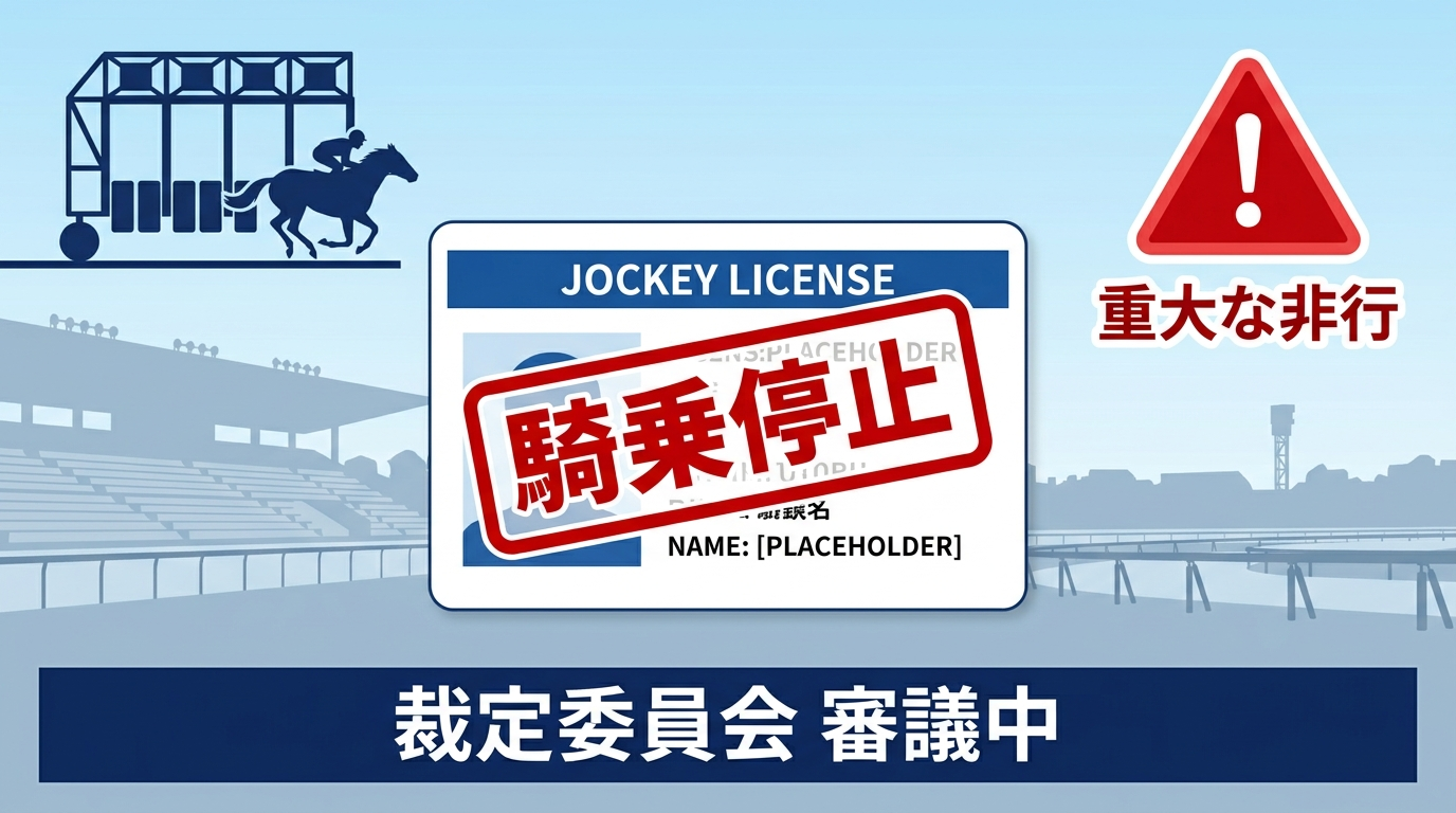 「重大な非行」の具体的内容は現時点で不明。20歳未満という年齢を理由に詳細が伏せられており、裁定委員会の議定まで騎乗停止が続く。過去事例から見ても、第147条第20号の適用は競馬界では最も重い部類の処分に相当する。裁定委員会の結果と、その後のJRAの発表に注目したい。