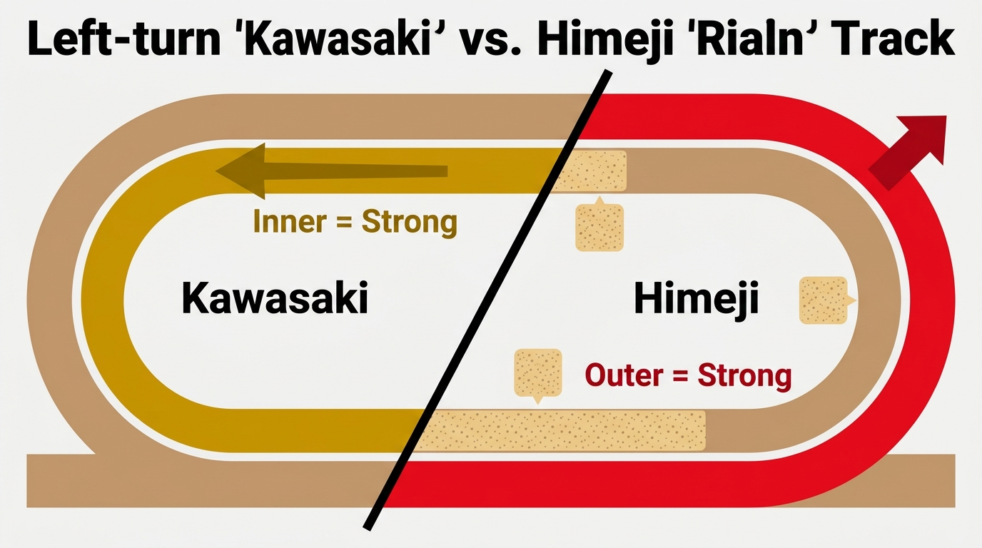 それが地方競馬の面白さだ。川崎と姫路は隣り合う「左回り」「右回り」の対照的な2場で、その枠順傾向は真逆に近い。この違いを知っているだけで、3/3の馬券精度が格段に上がる。