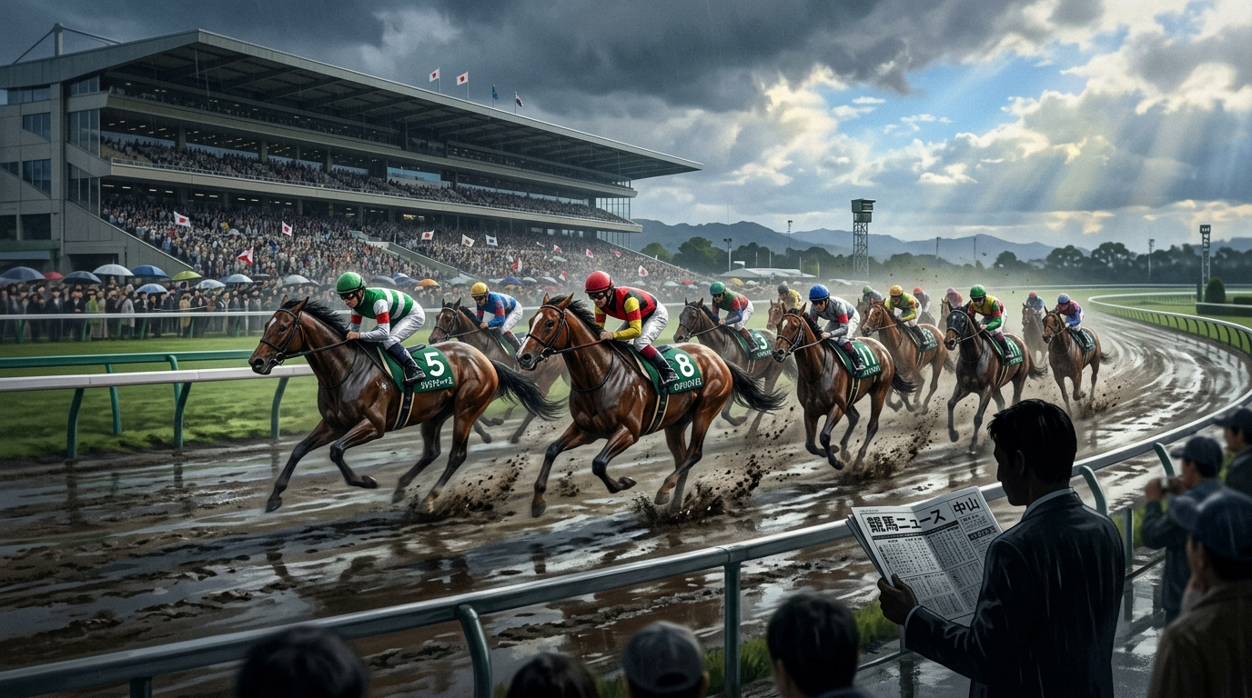 中山の最終レースといえば「急坂」が最大のファクター。道悪ダートになれば、母父にミスタープロスペクター系(A.P. Indy、Storm Cat系統)を持つスピード持続力型が有利になりやすい。長い直線を走り切る持続力と、湿った砂でも粘れるパワーを兼備した馬を軸に。