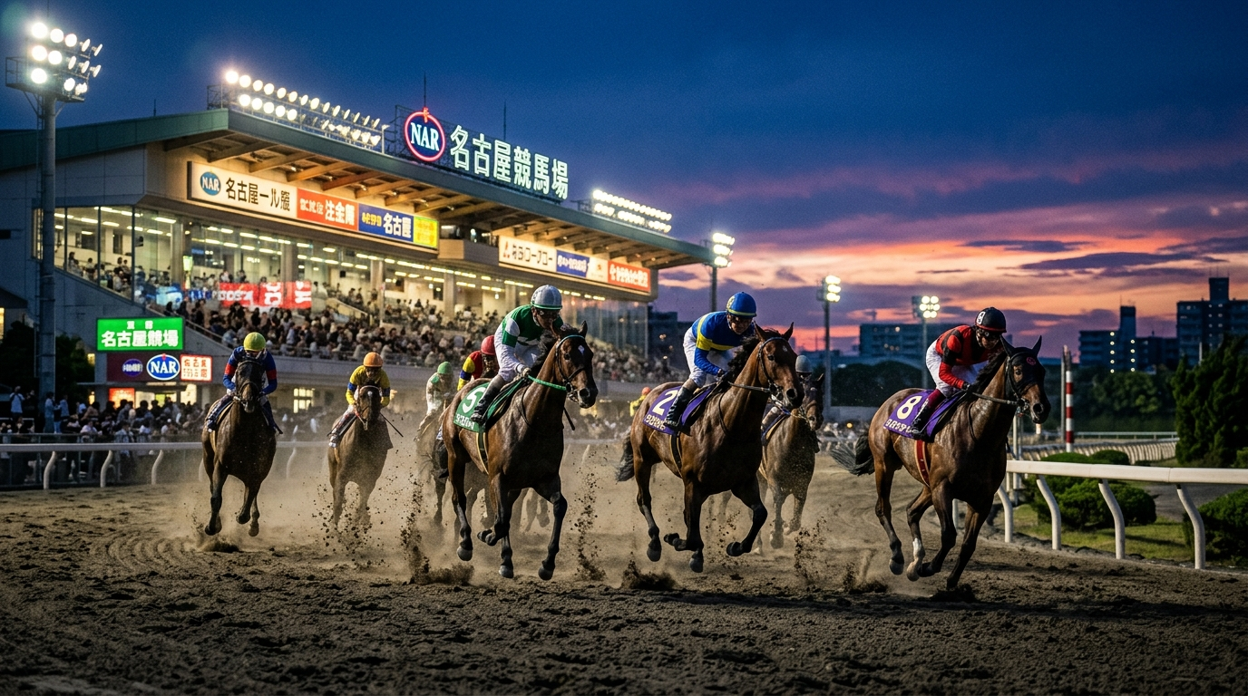 名古屋競馬場(2022年に弥富トレーニングセンターへ移転)は、右回り1周約1,100mの小回りコースだ。コーナーを最大6回通過する距離設定もあり、内枠・先行脚質が圧倒的に有利という馬場特性を持つ。